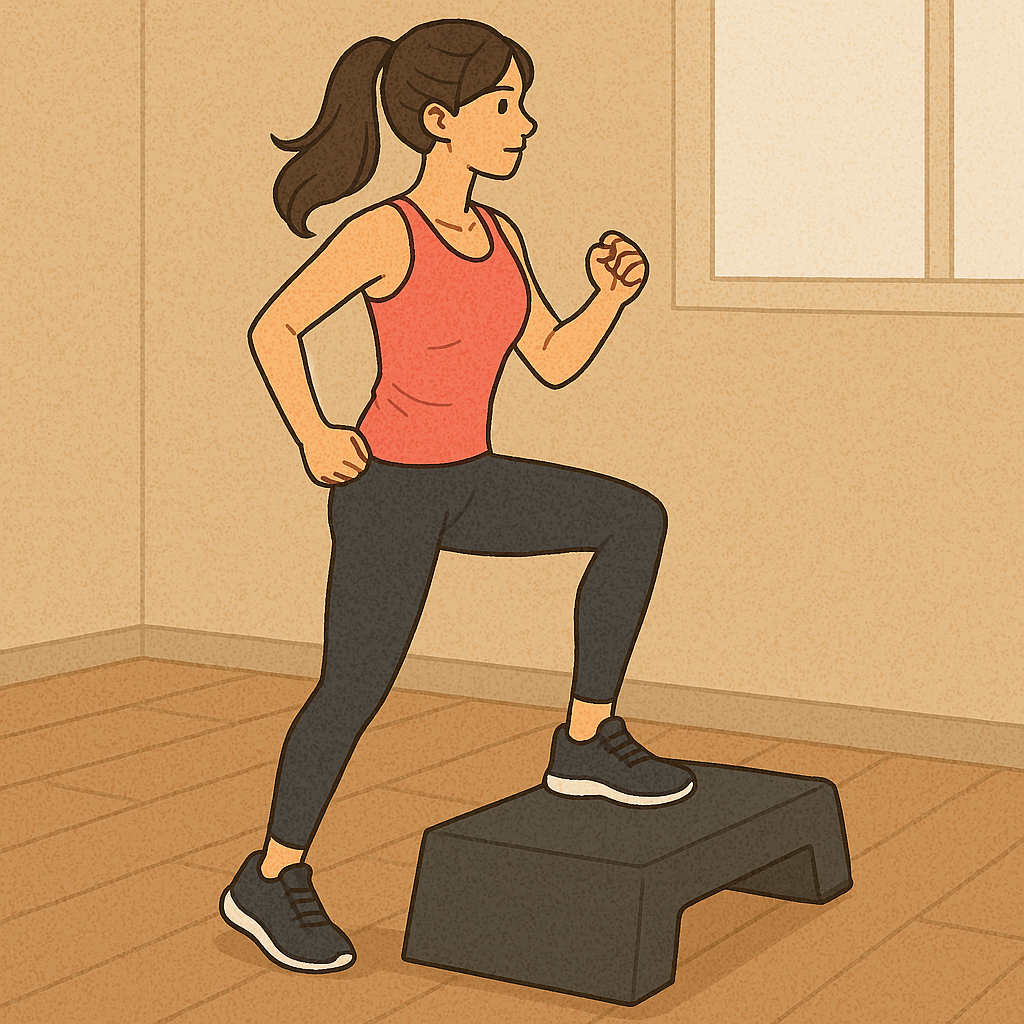 계단이 없는 집에 살고 있다면 스텝박스를 활용하거나 단단한 의자, 낮은 받침대를 이용해 운동할 수 있습니다. 무릎 높이 정도의 받침대에 올라갔다 내려오는 동작을 반복하는 것만으로도 비슷한 효과를 얻을 수 있습니다.
